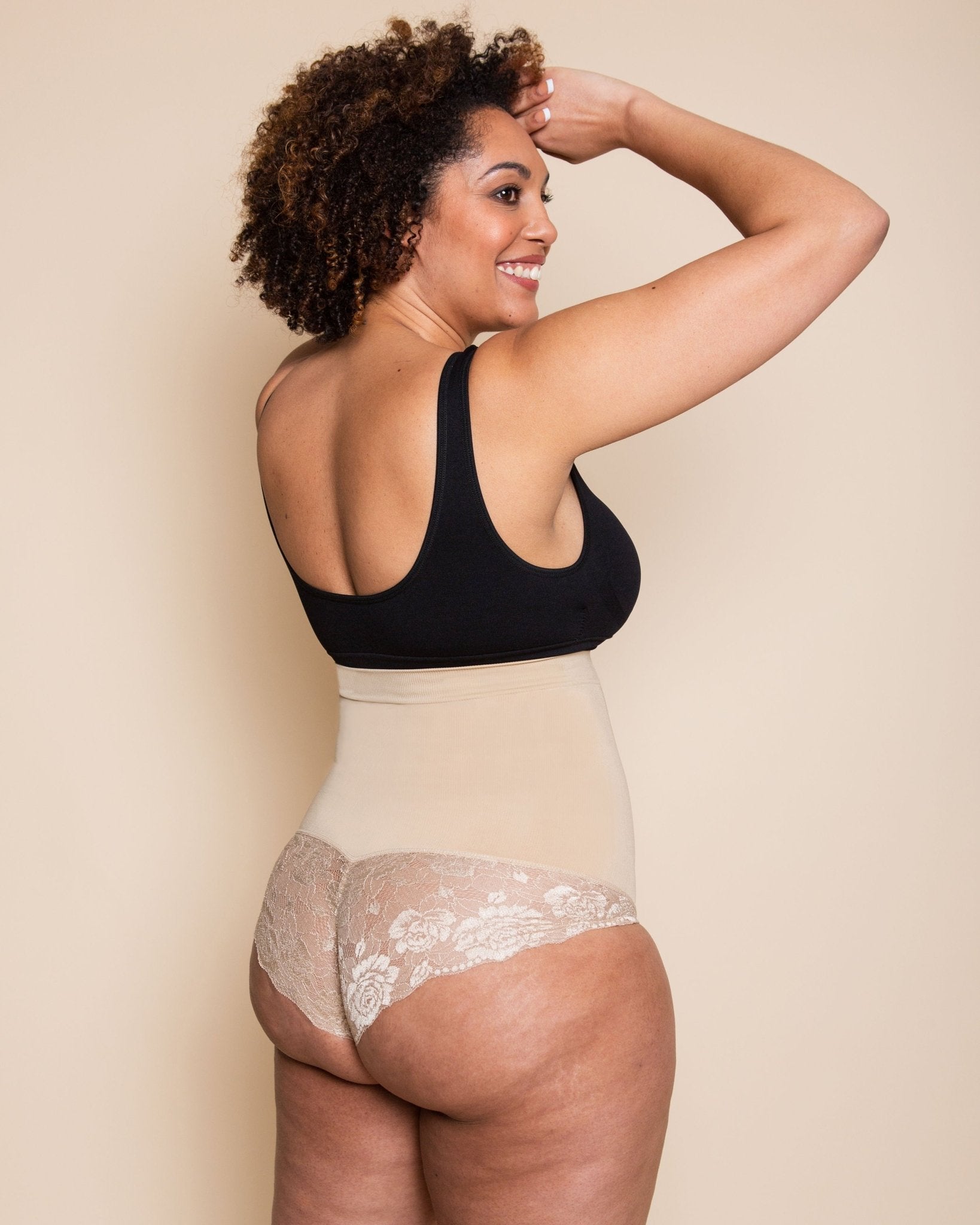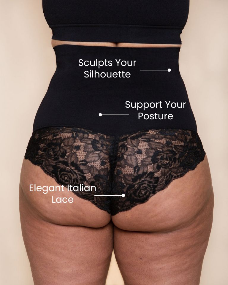 Firm sculpting effect meets elegant Italian lace, with a high-waisted fit for a smooth, contoured silhouette.